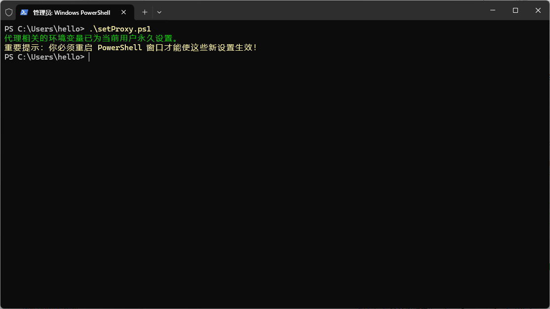 Write-Host "重要提示:你必须重启 PowerShell 窗口才能使这些新设置生效!" -ForegroundColor Yellow保存后在命令终端执行 .\setProxy.ps1 就可以了。