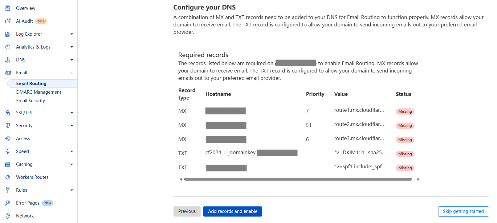 第 1 步:在 Cloudflare 需要配置邮箱的域名中,打开左边栏 Email Routing 菜单项,点击开始 Get Started。