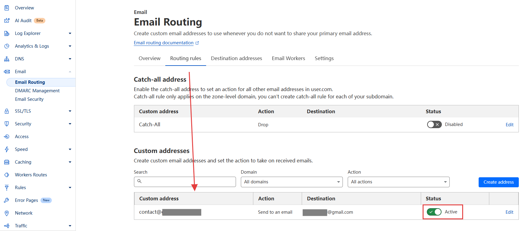 第 5 步:成功后,可以在 Routing rules 标签页查看邮箱解析状态。此时状态为有效 Active。