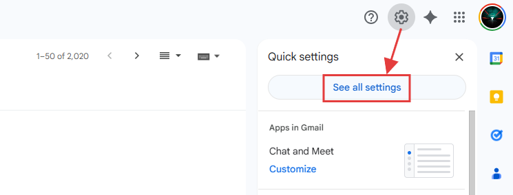 第 1 步:登录 Gmail 邮箱,在右上角的设置那里打开所有设置。