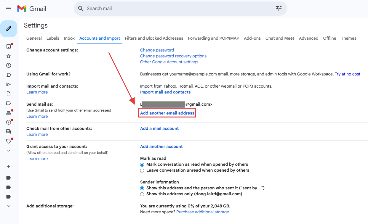 第 2 步:选择账号与导入。找到 Send mail as 区域,添加另一个邮箱地址。