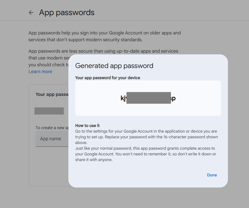 第 4 步:点开下一步的前提是 Gmail 的 google 账户需要打开二级验证,同时需要生成一个 App Passwords 密码。如果 google 账户已经打开二级验证设置,那么通过这个链接【https://myaccount.google.com/apppasswords】设置一个 App Passwords,密码名称可以自行命名。