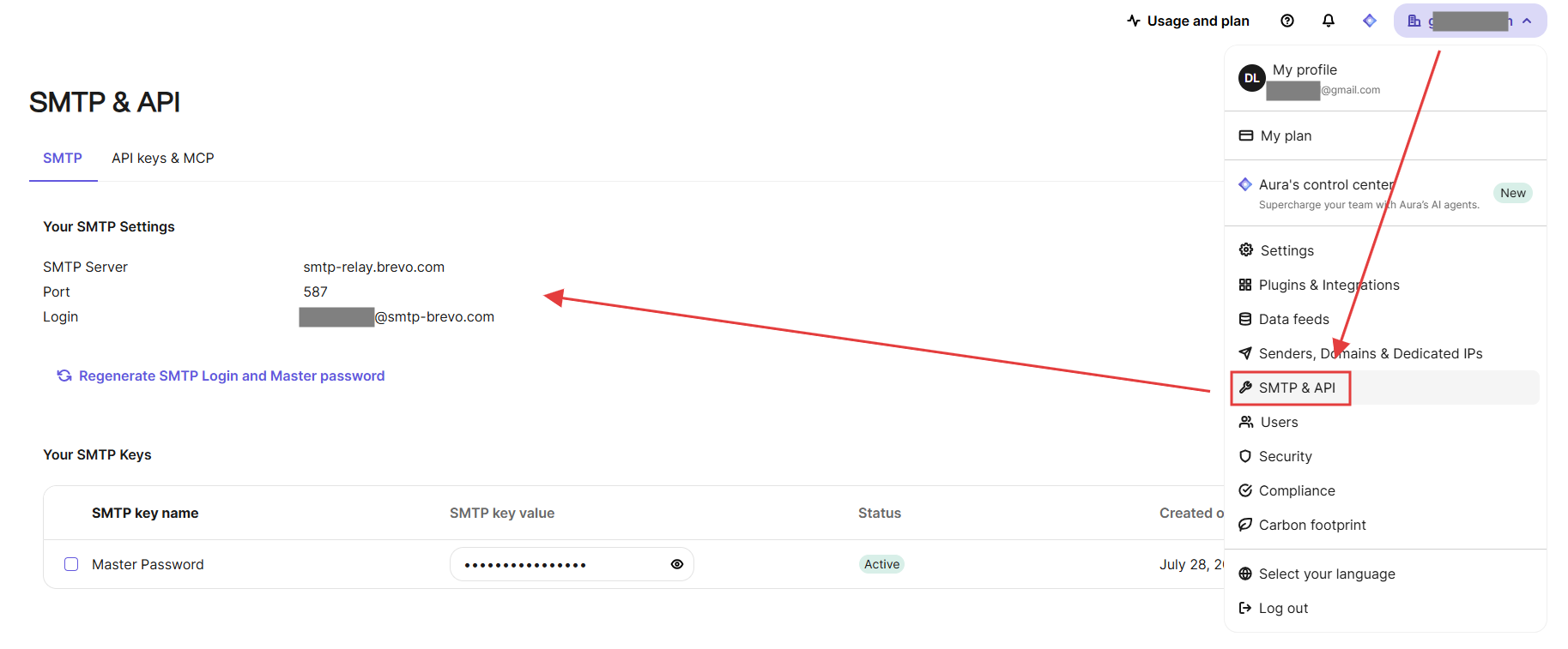 第 4 步:重新打开 Brevo 右上角的菜单,找到 SMTP & API 打开,它就显示出了后续可以添加到 Gmail 的 SMTP 服务器信息,包括端口号,用户名和密码。密码需要在下面点击生成一个新的密码,同样需要保存到一个地方以后可以找到,它显示一次后面就不再显示了。