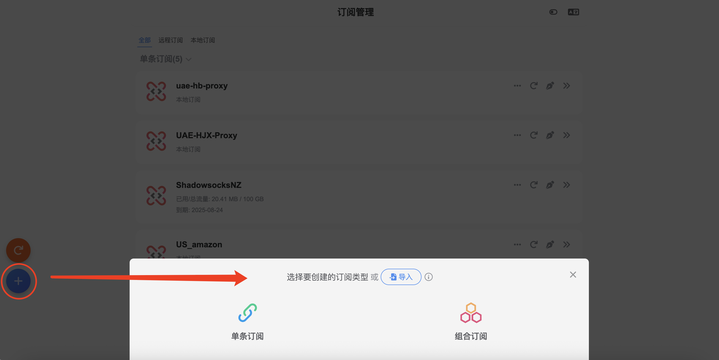 点击左边的 + 号添加,就可以看到如下界面,单条订阅和组合订阅的区别是针对于订阅链接是否是单个而言的,一个订阅中可以包含有多条节点信息,可以在单条订阅中添加多个节点。