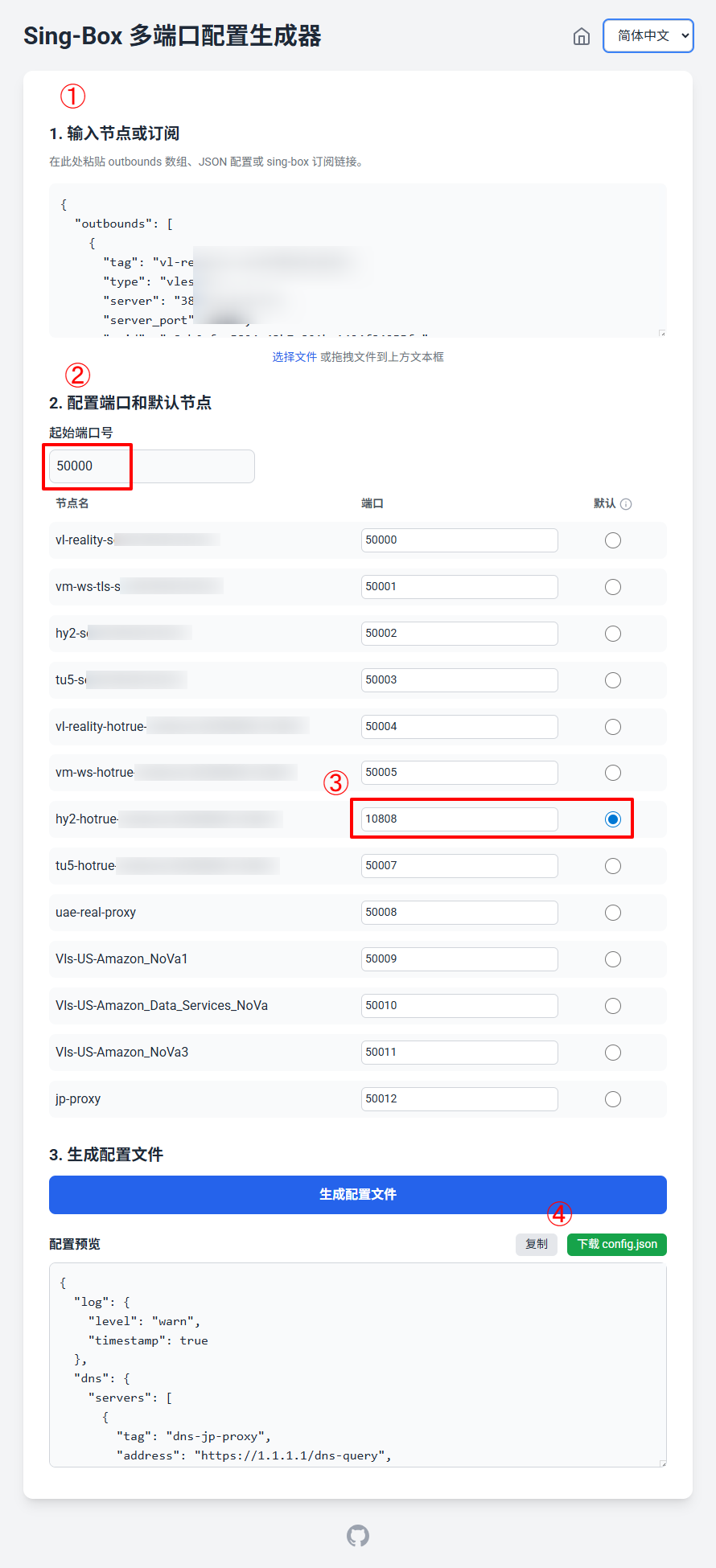 outbounds数组或上传完整的配置文件。 - 智能端口分配: 可设置起始端口号,为所有节点自动分配递增的端口,默认为