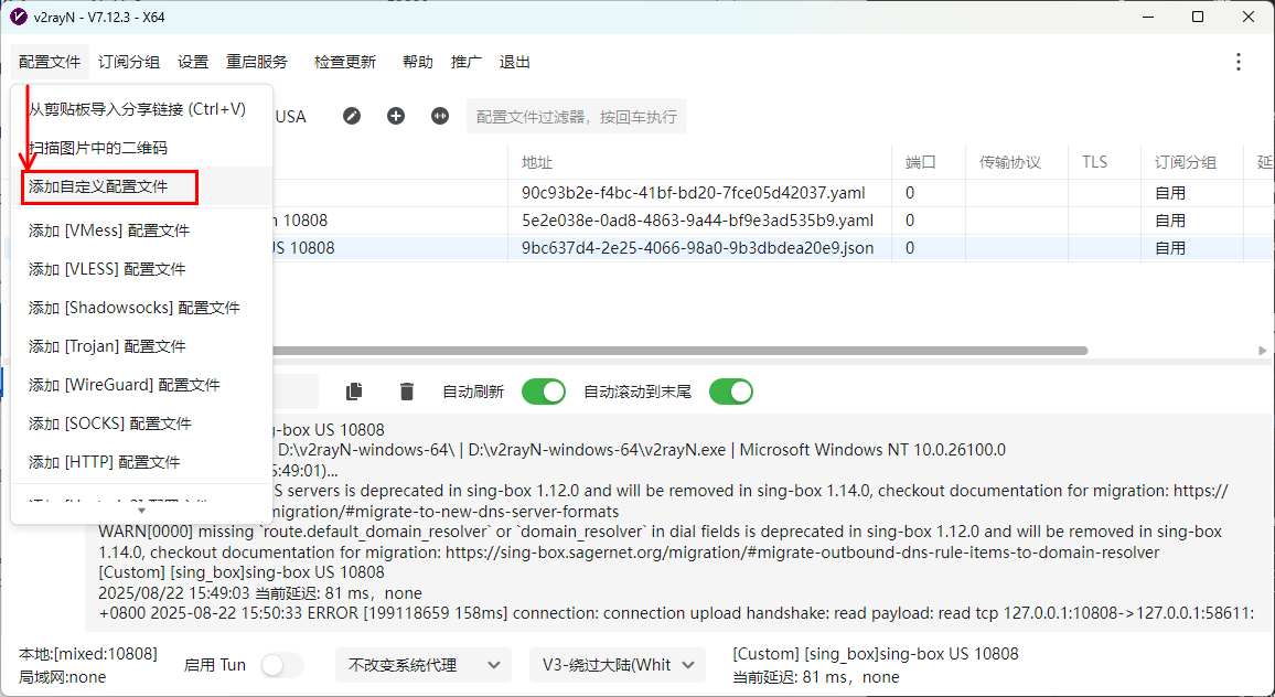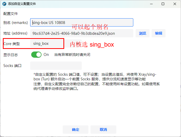 Core 类型那里需要选sing_box。最后确定,再在主界面选择添加的这个配置激活就可以了。