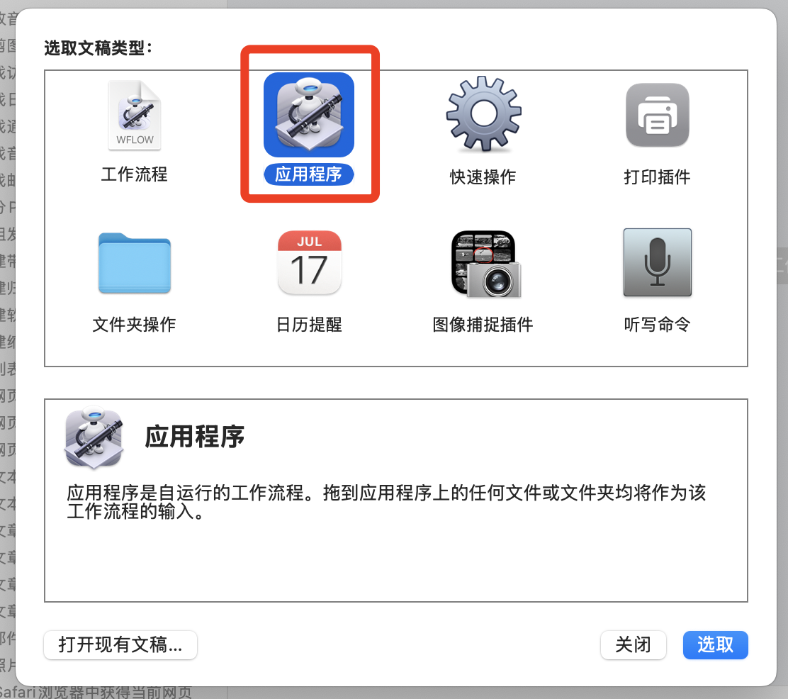 创建桌面快捷方式 方法 :使用 Automator finder 程序(即自动操作程序)中点击左侧 应用程序 找到 Automator 选择 “应用程序” 类型。