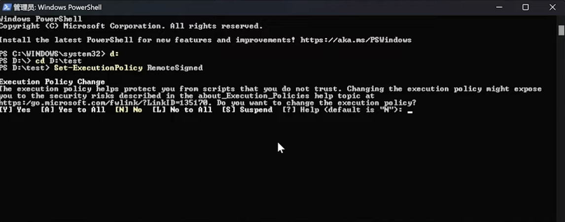 Set-ExecutionPolicy RemoteSigned如果提示是否更改执行策略,输入 Y 并回车。